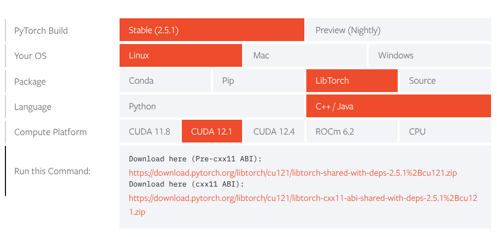 libtorch: Download libtorch for your architecture (GPU or CPU), with or without dependencies as required by your environment, from official website. I have downloaded for CUDA-12.1 and with dependencies. At the time of writing, downloaded for CUDA=12.1, libtorch for pytorch 2.5.1 is what was available. Unzip the download.